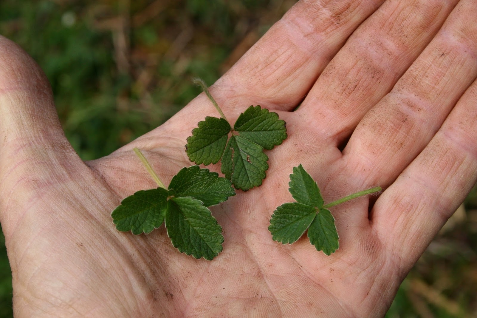 And when they are not in flower, the leaves are different. Like the fruity wild strawberries, the leaves are composed of three leaflets. The last tooth on the end of the central leaflet of a true wild strawberry leaf is longer than the teeth to either side, but on the barren strawberry its so small you can hardly see it.