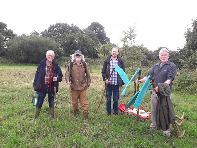 Last Sunday five of us finished the job started in July, scything a section of the top meadow to promote wild flowers.